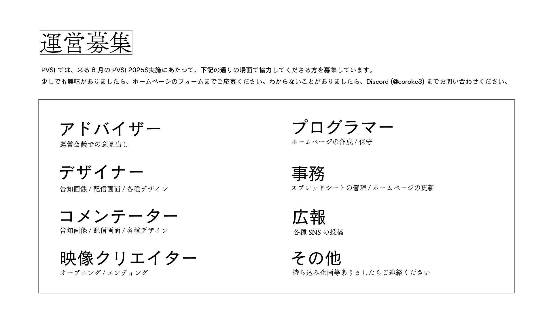 運営会議での意見出しです。PVSFってもっとこうしたほうがいいんだよなみたいなものが心の内にある方や、ただただ改善策思い浮かばないけど不満はあるみたいな方でも大丈夫です!ぜひ。